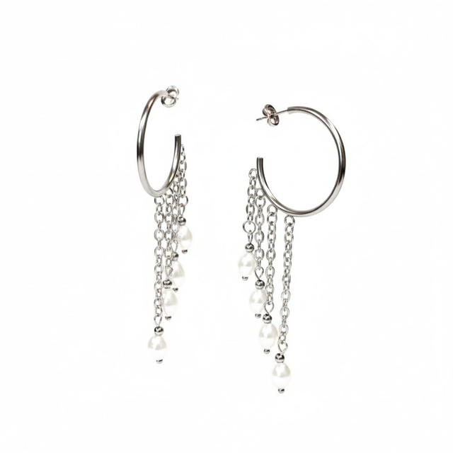 Material Principal: O corpo da peça é de Aço Inoxidável; os pendentes são correntes de Aço Inoxidável com Pérolas sintéticas